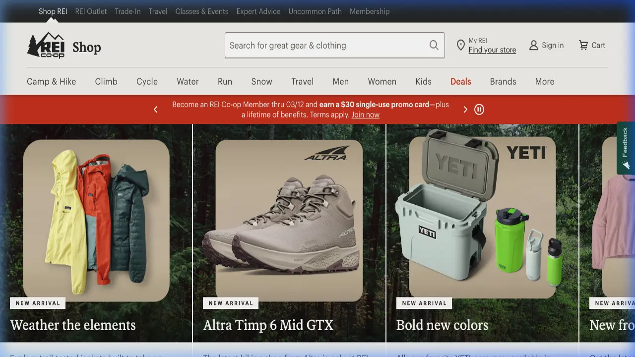 REI(アールイーアイ)は、アメリカ最大級のアウトドア用品の生活協同組合(コープ)です。高品質でコスパに優れた自社ブランド「REI Co-op」をはじめ、世界トップクラスのアウトドアギアを幅広く取り揃えています。